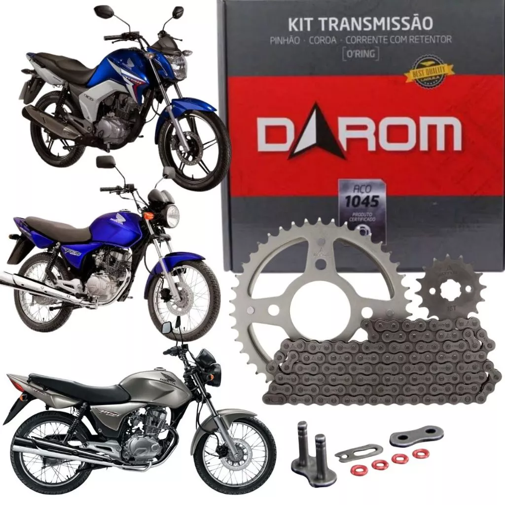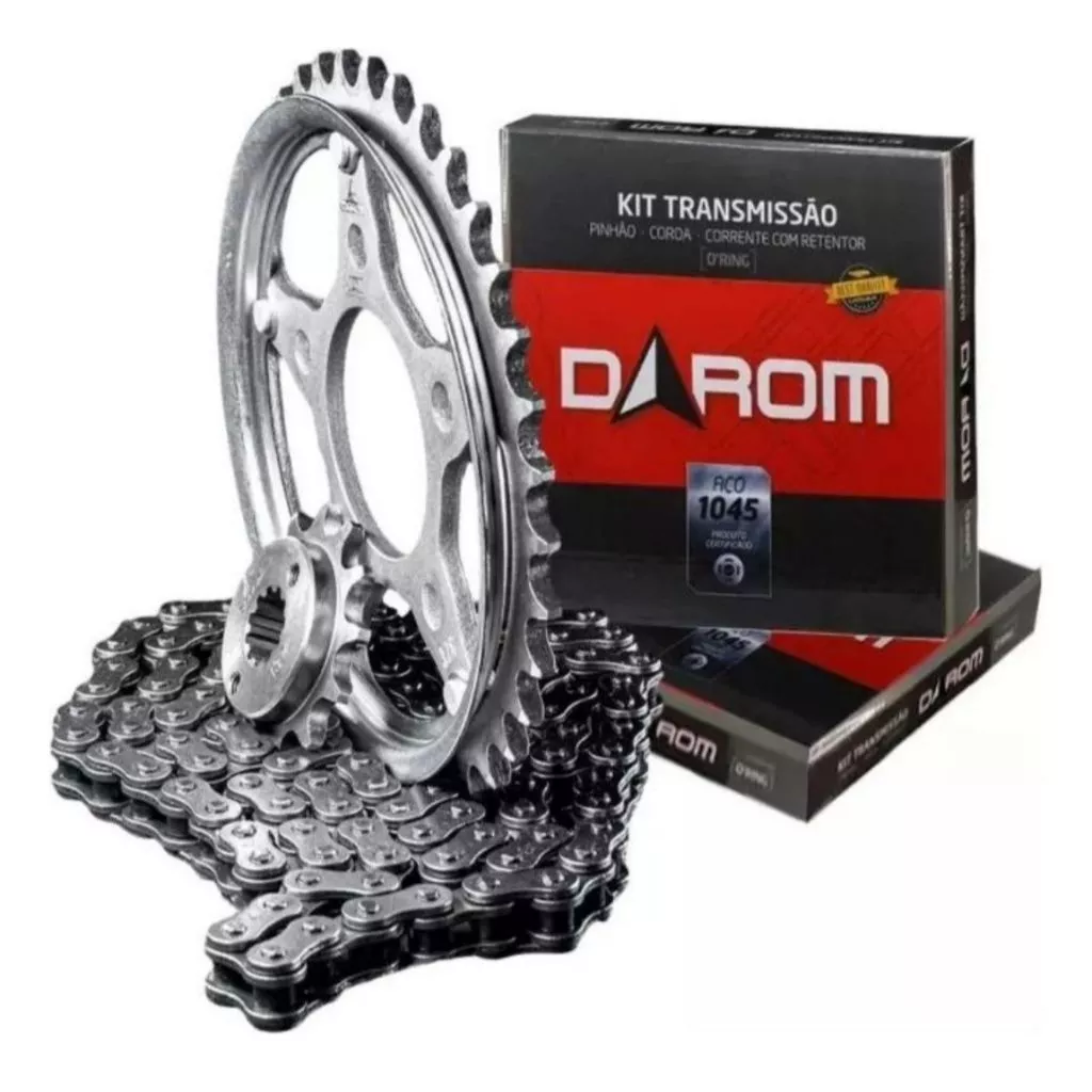 DAROM : Com certificação do Inmetro, os kits de transmissão e as correntes Darom oferecem qualidade e durabilidade, com resistência acima do padrão exigido, com Darom você atinge desempenho igual ao de Peças Originais da Moto.